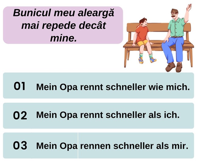 ✅ Întrebarea 1 (Nivel B1) Cum traduci corect propoziția: „Deschid fereastra pentru că este prea cald în cameră.” Alege varianta corectă: A) Ich mache das Fenster auf, weil es im Zimmer zu heiß ist. B) Ich öffne das Fenster, weil zu heiß im Zimmer ist. C) Ich mache auf das Fenster, weil es im Zimmer ist zu heiß. D) Ich öffne das Fenster, weil es zu heiß im Zimmer ist. ✔️ Răspuns corect: A 🧠 Explicație: „aufmachen” este un verb separabil: „ich mache das Fenster auf”. „weil” introduce o propoziție subordonată → verbul se duce la final („ist”). „im Zimmer” = „în cameră” (Dativ, poziție statică). 🛑 Variante greșite: B:… Read More